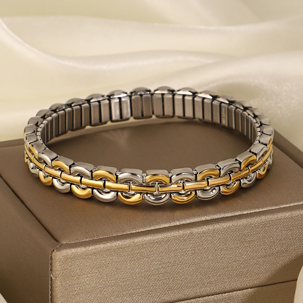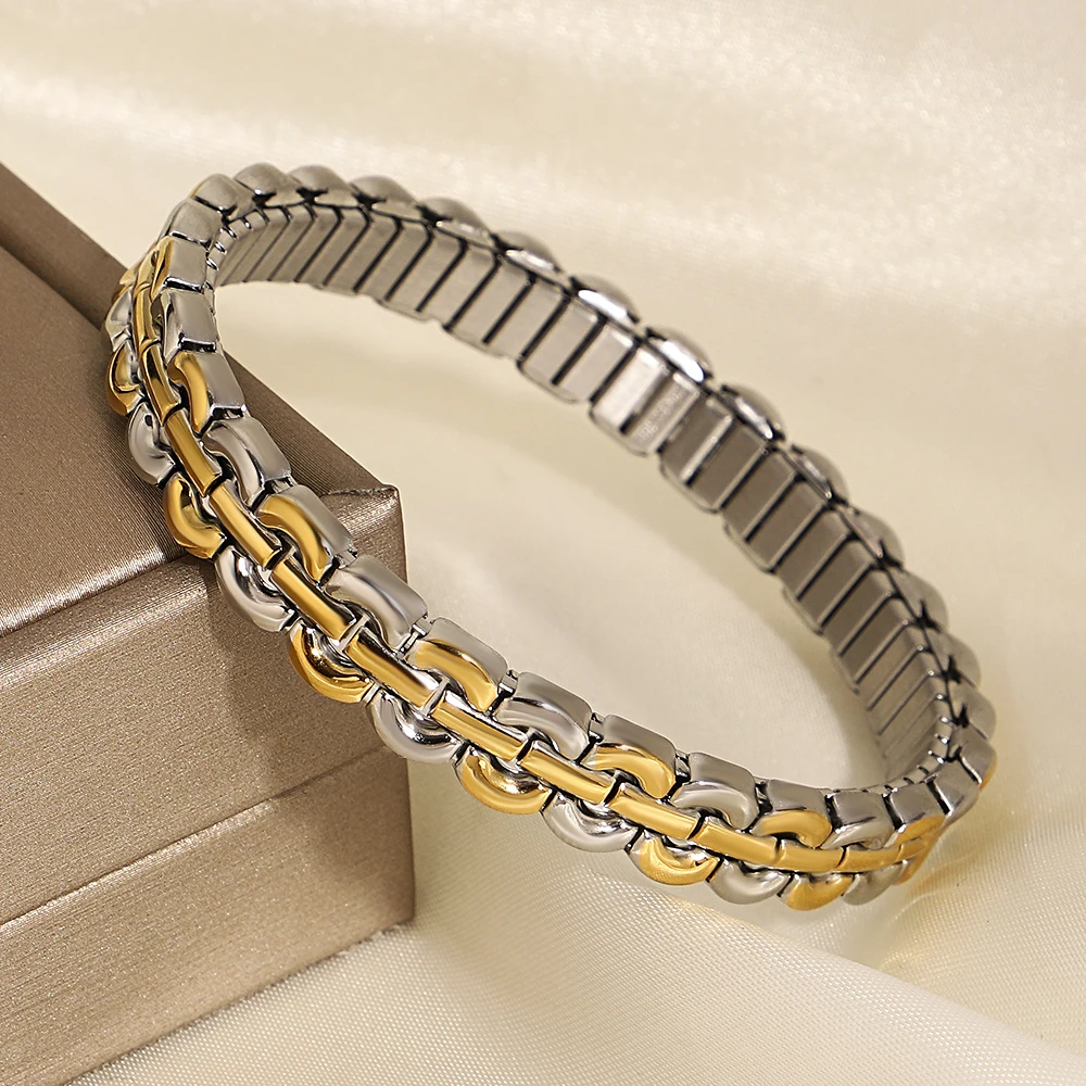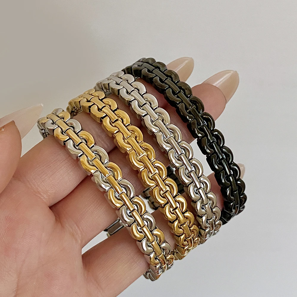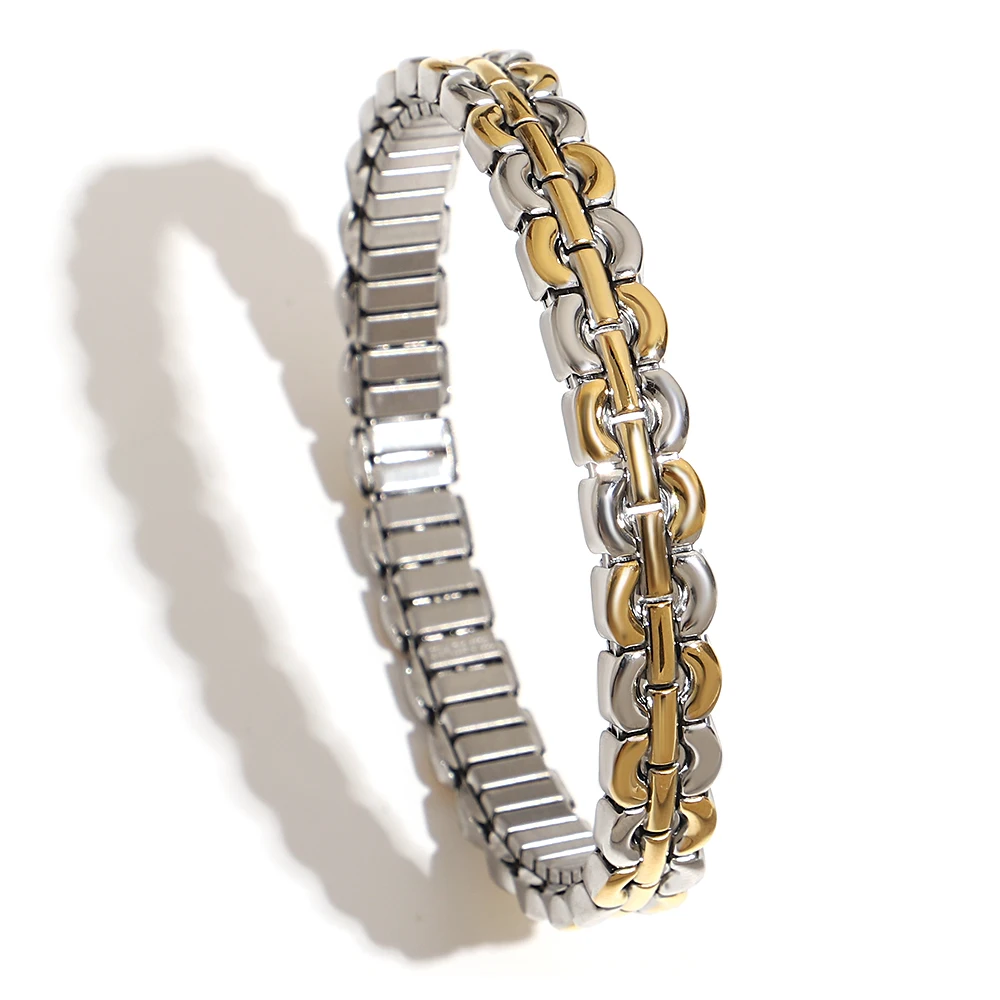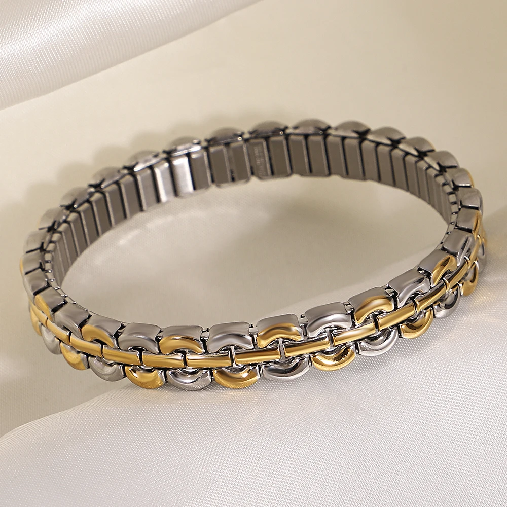 Stainless Steel Semi-Circular Link Bracelet – Two-Tone & Mono-Tone Bangle for Women