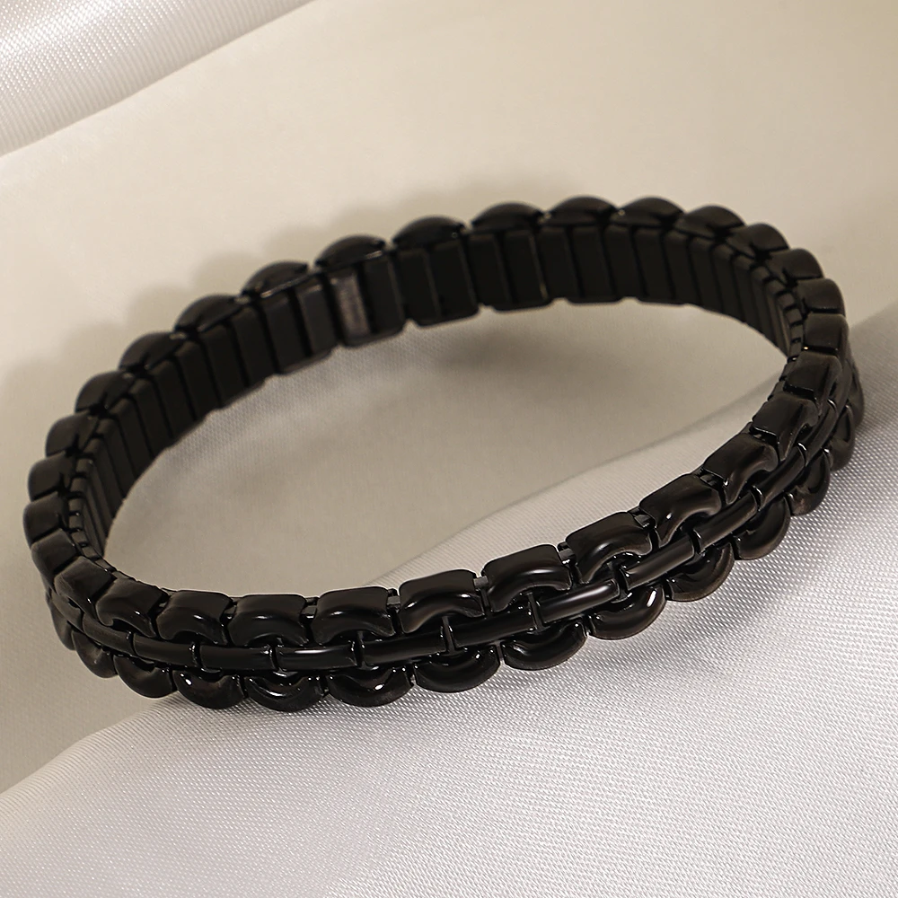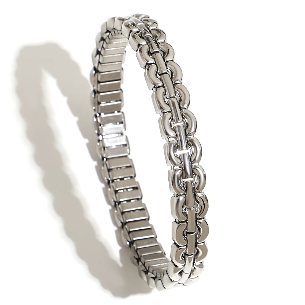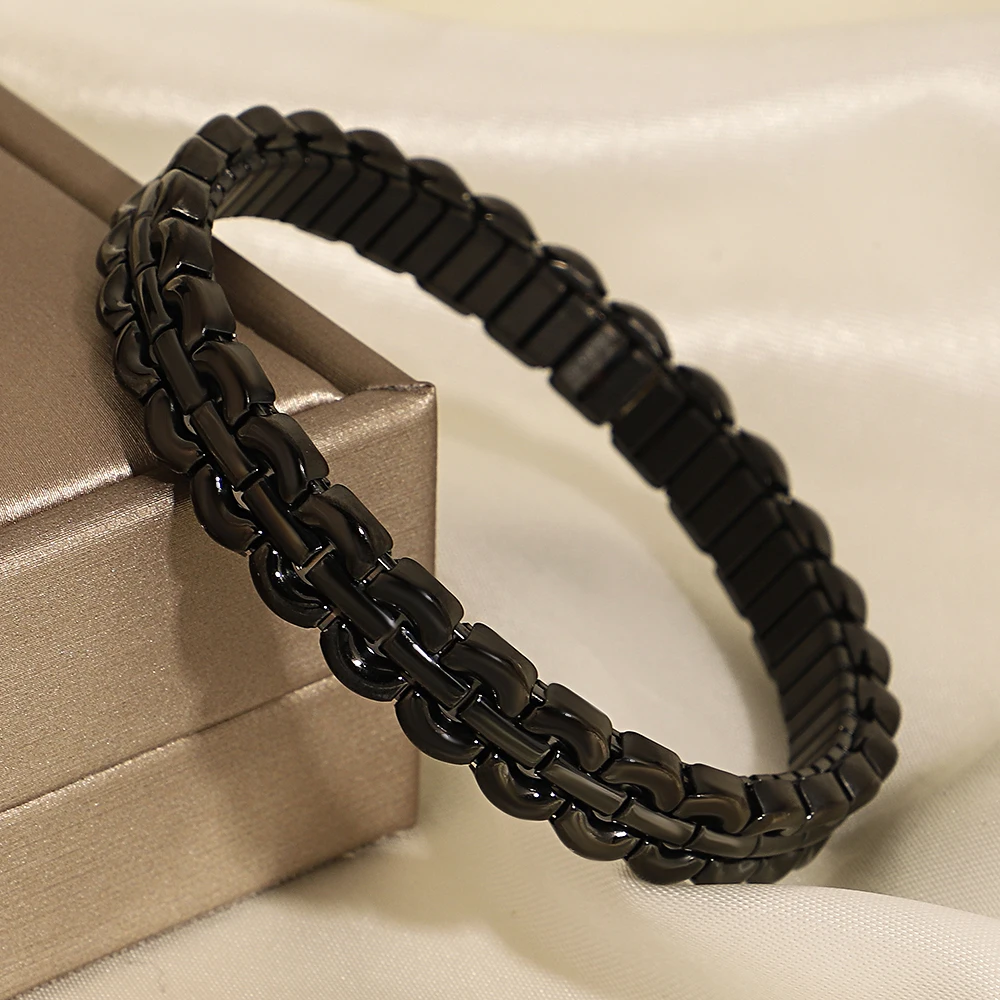 Designed for timeless appeal and everyday wear, this Semi-Circular Stainless Steel Link Bracelet brings sophistication and versatility together. Whether you prefer classic silver, bold black, or elegant two-tone gold, this bracelet blends perfectly with both casual and dressed-up looks.